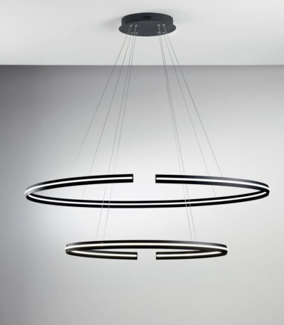 Lampadario da salotto modello CLARKE S120 composto da una struttura in alluminio colore nero goffrato e da 2 elementi dalla forma ellittica ovale con diffusore in silicone.