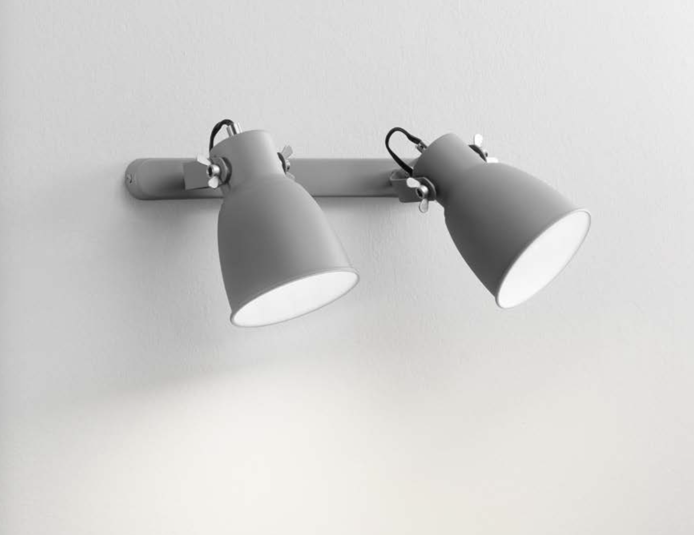 Applique da parete serie LEGEND in stile industriale composta da un asta lineare in metallo verniciato grigio e 2 diffusori orientabili in tinta con la struttura con interno bianco per risaltare la luminosità della lampadina.