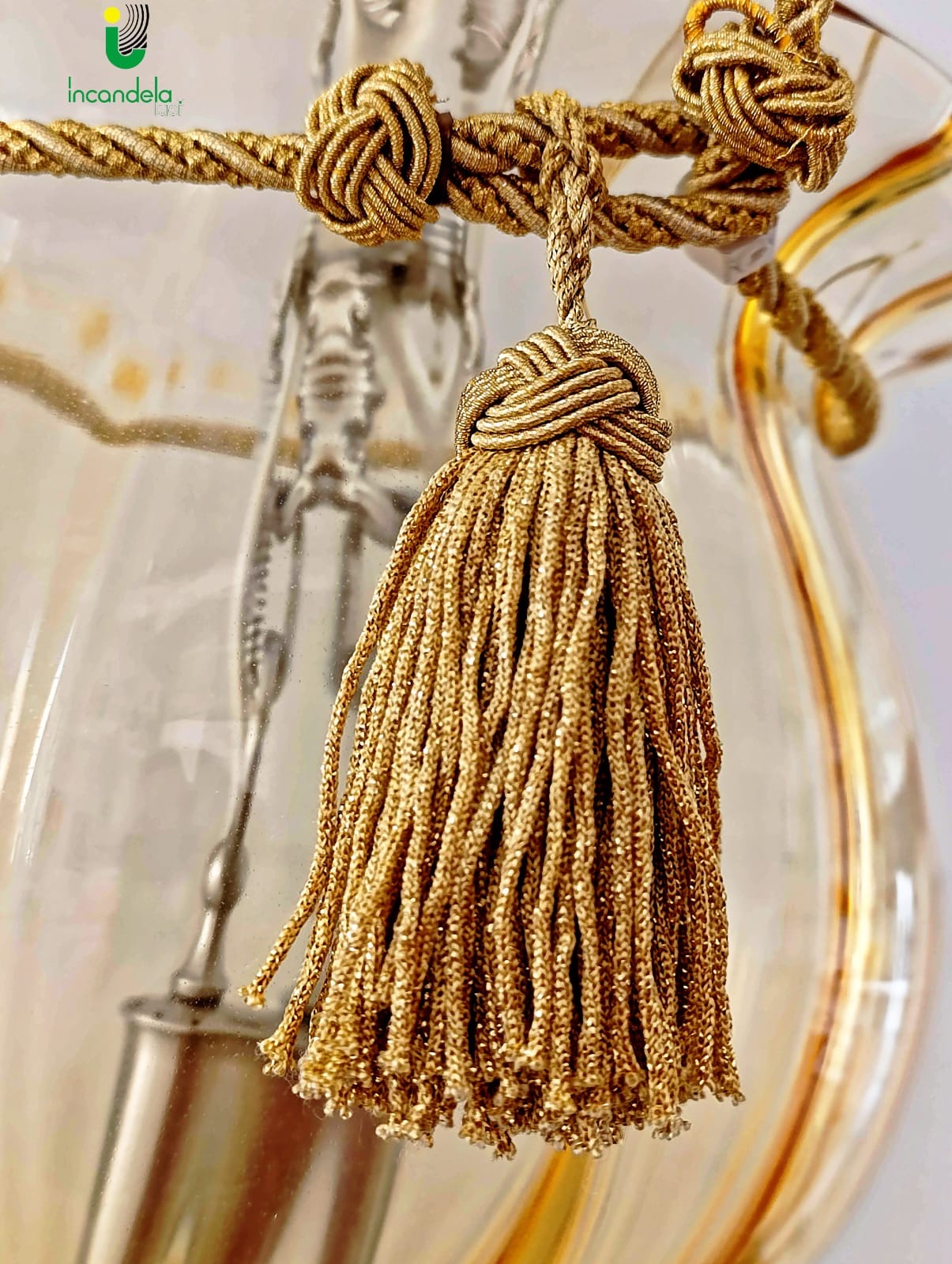 Sospensione in vetro di Murano ambra con cordone dorato e montatura Nikel