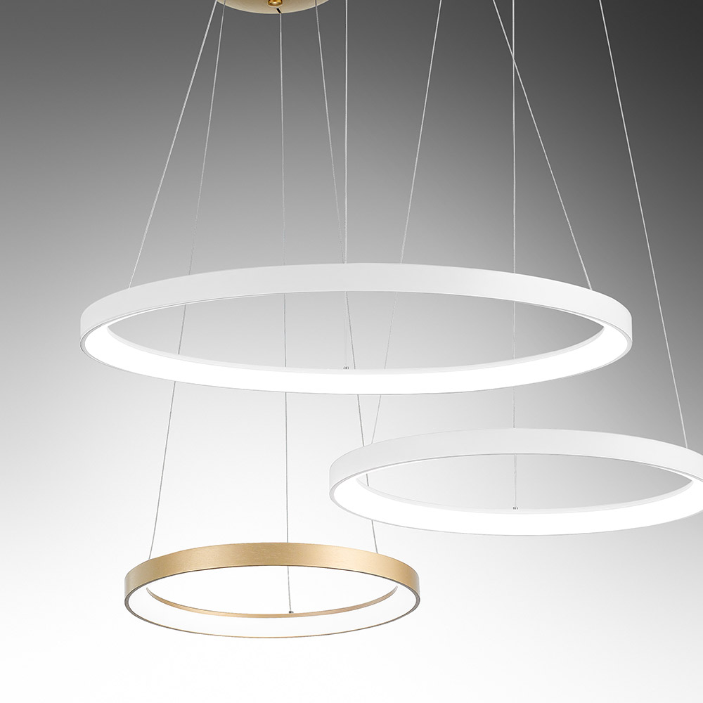 Lampada a sospensione moderna GEA LUCE KRIZIA composta da una montatura in alluminio satinato bianco o oro spazzolato e diffusore in acrilico bianco opale. Con geometrie perfette, composte da una serie di punti led equidistanti da un centro. Sorgente luminosa led, dimmerabile tramite dimmer esterno + push (non incluso). Ideale per illuminare un tavolo della cucina o della sala da pranzo.