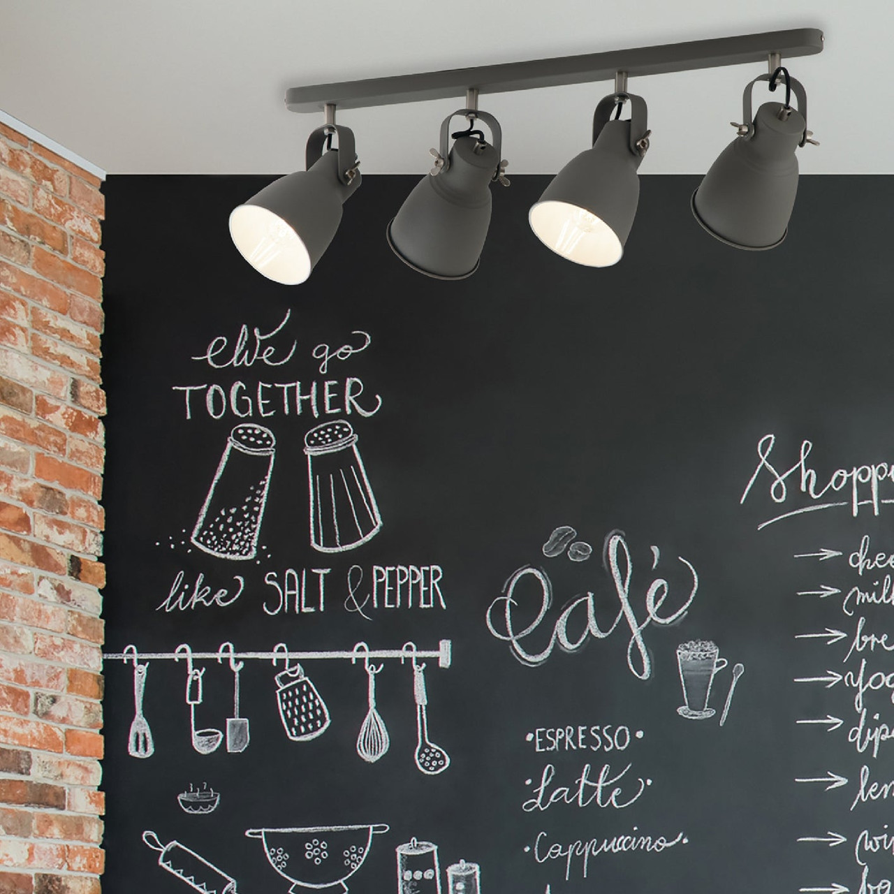 Applique da parete serie LEGEND in stile industriale composta da un asta lineare in metallo verniciato grigio e 4 diffusori orientabili in tinta con la struttura con interno bianco per risaltare la luminosità della lampadina.