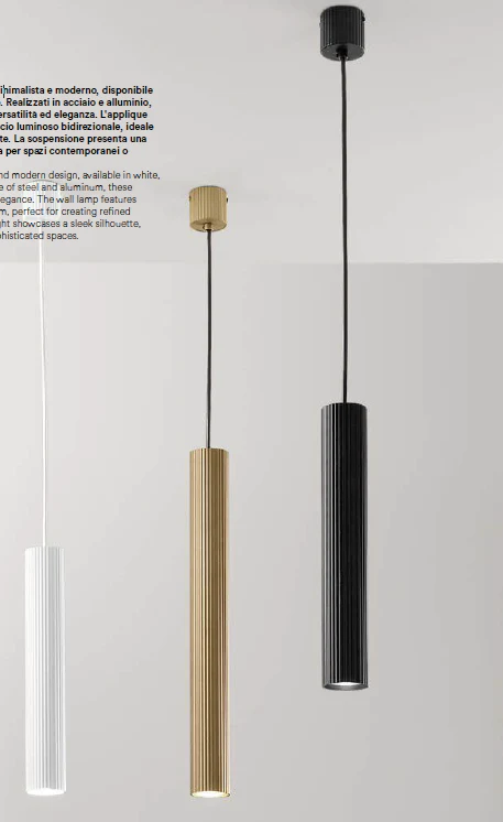 L’applique si distingue per il doppio fascio luminoso bidirezionale, ideale per creare atmosfere raffinate. La sospensione presenta una silhouette slanciata, perfetta per spazi contemporanei o