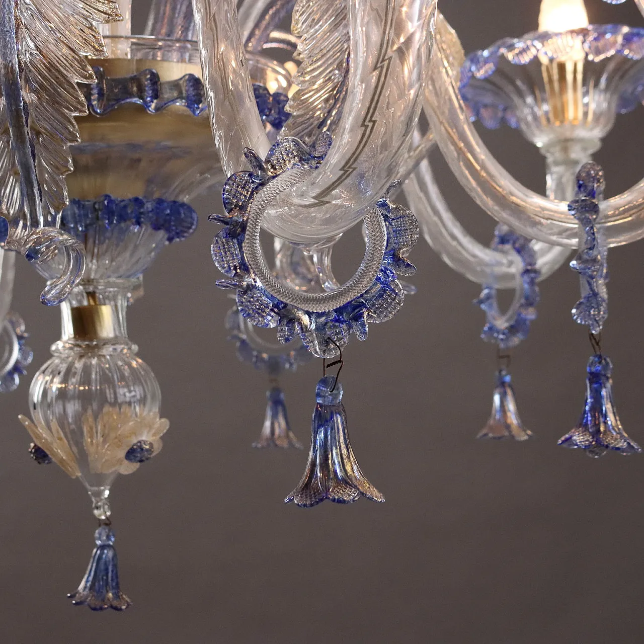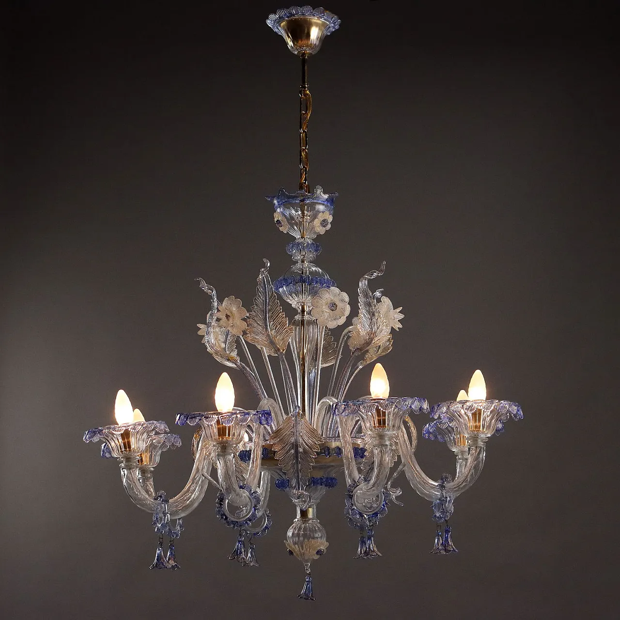 Veneziano è un lampadario iconico e rappresentativo della lavorazione muranese. Bracci a torciglione in cristallo decorati blu e polvere d’oro.