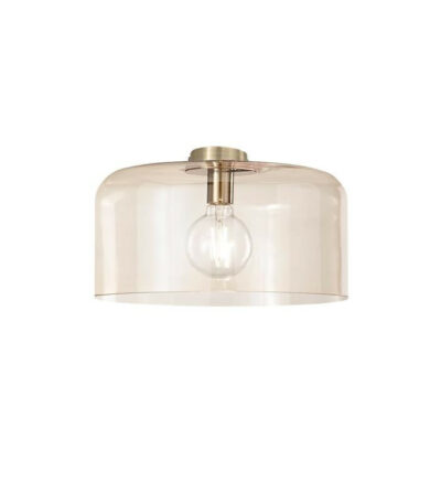 La montatura in metallo finitura oro è abbinata a un diffusore a forma di cupola in vetro soffiato colore ambra conferisce un tocco di colore e raffinatezza a qualsiasi tipo di arredamento. La brillantezza del vetro semitrasparente consente una diffusione omogenea della luce in tutta la stanza.