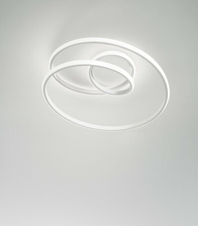 Plafoniera COASTER firmata dal brand Luce Ambiente Design, realizzata con struttura in alluminio e profilo curvo composto da elementi circolari a più livelli con diffusore in silicone.